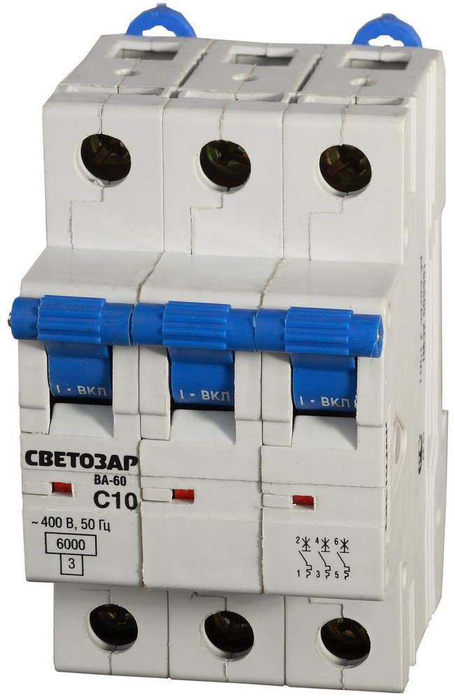 Автоматический 3-полюсный выключатель СВЕТОЗАР ″C″, 6 кА, 400 В выполняет функцию защиты установок от перегрузок и коротких замыканий. Он применяются в жилых, промышленных и административных зданиях. Главная особенность при выборе выключателя: он должен соответствовать напряжению и расчётному току цепи. Прибор выключает сеть при 5-10 кратном превышении номинальной силы тока. Выключатель превосходит параметры ГОСТ (от -5°С до +40°С), поскольку устойчив к температурам от -40°С до +45°С.