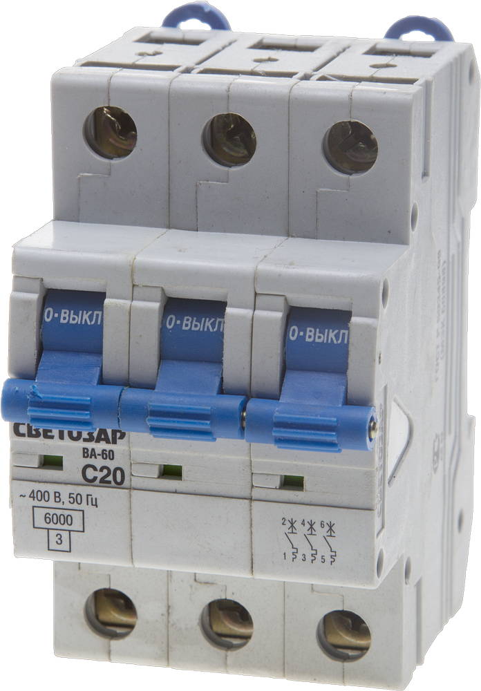 Автоматический 3-полюсный выключатель СВЕТОЗАР ″C″, 6 кА, 400 В выполняет функцию защиты установок от перегрузок и коротких замыканий. Он применяются в жилых, промышленных и административных зданиях. Главная особенность при выборе выключателя: он должен соответствовать напряжению и расчётному току цепи. Прибор выключает сеть при 5-10 кратном превышении номинальной силы тока. Выключатель превосходит параметры ГОСТ (от -5°С до +40°С), поскольку устойчив к температурам от -40°С до +45°С.