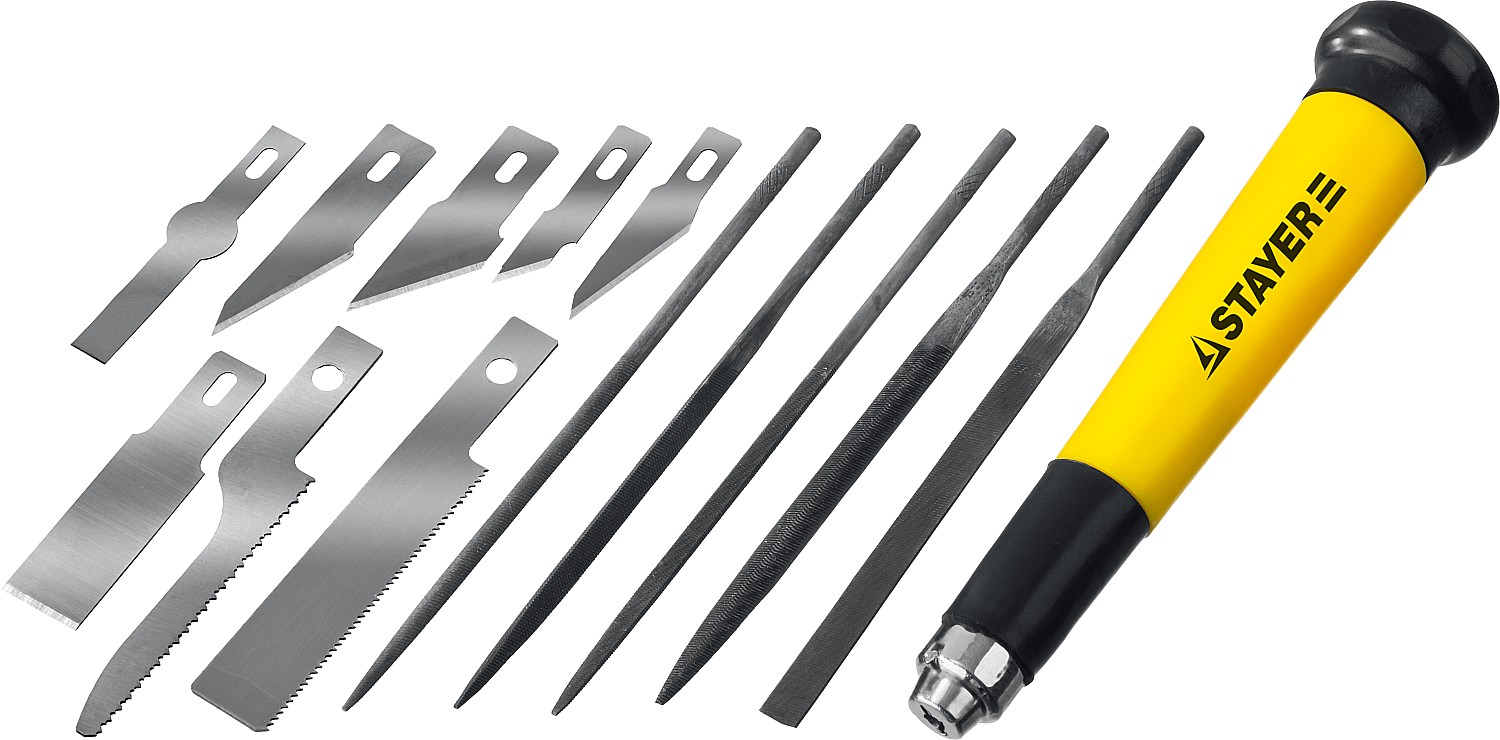 Многоцелевой набор для точных работ с картоном, древесиной, пластиком, металлом. Высококачественные острые лезвия различных форм и размеров, пильные полотна с мелким зубом и надфили обеспечат чистое, точное и комфортное выполнение работ