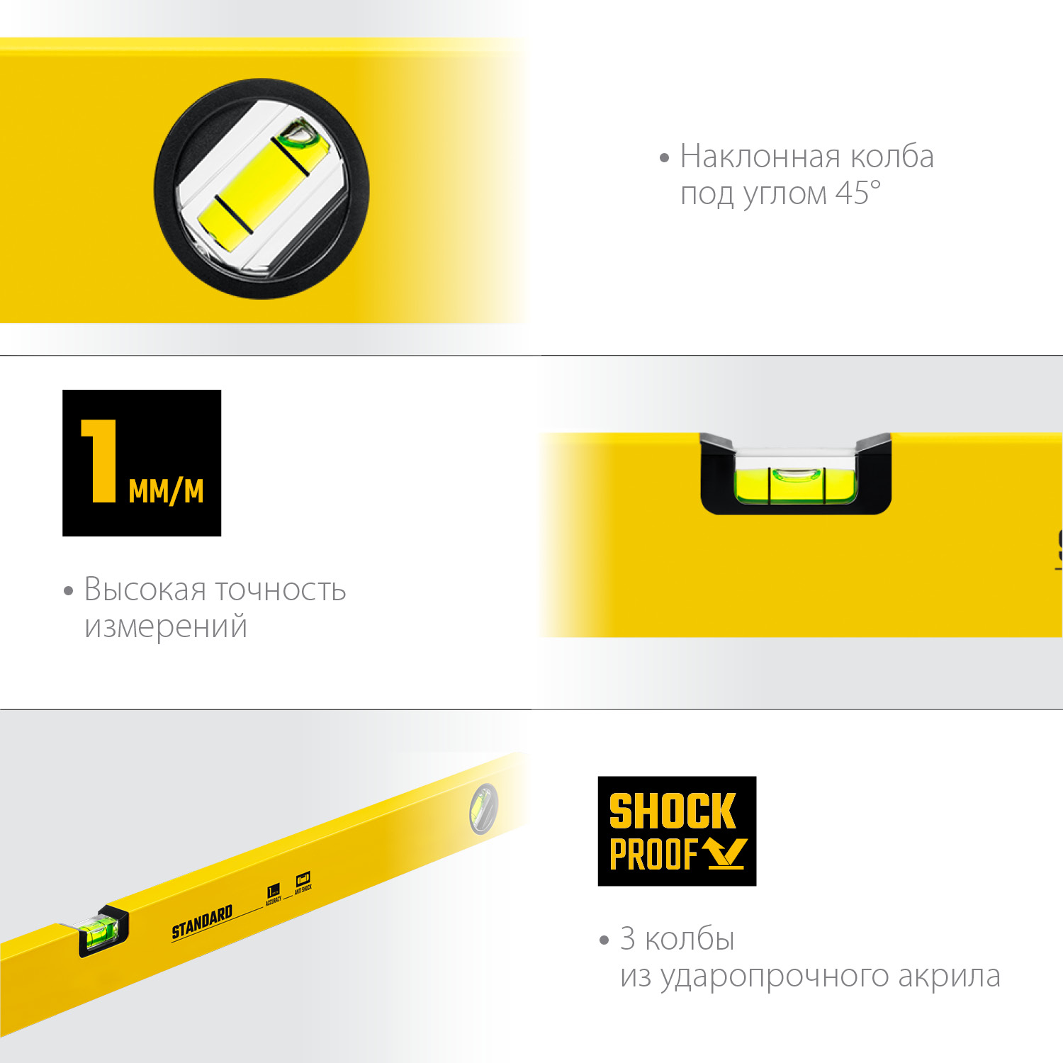 Строительный уровень с колбами из ударопрочного акрила