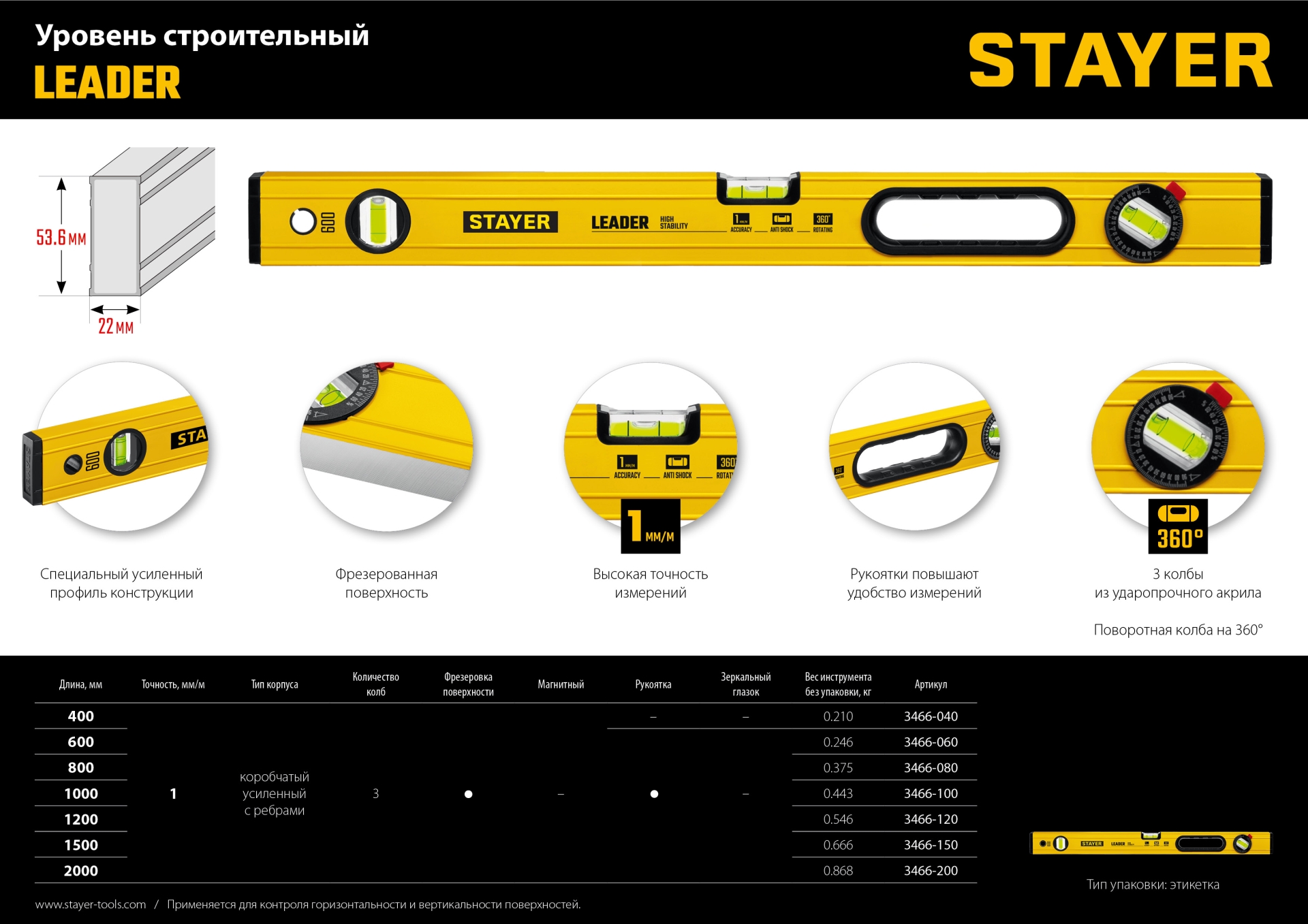 STAYER Leader 1200 мм, Строительный фрезерованный уровень (3466-120)3466-120_z01