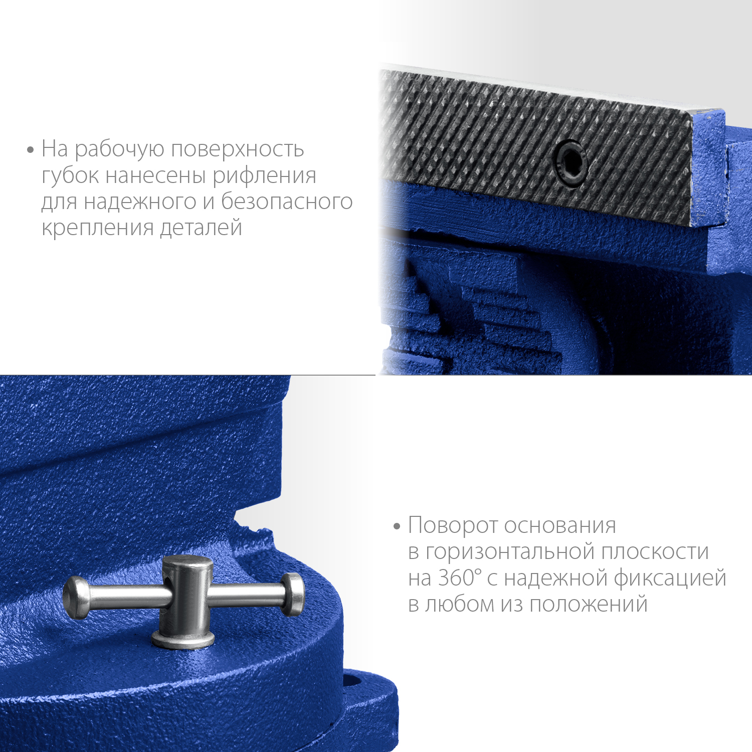 • Поворотное основание позволяет перемещать корпус тисков в горизонтальной плоскости на угол от 0 до 360 градусов