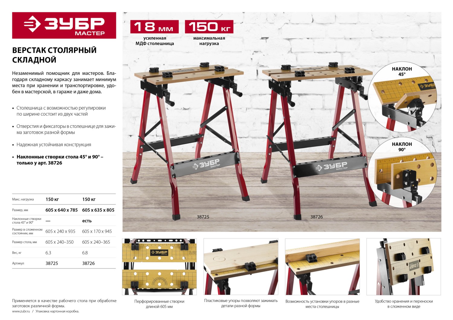 Незаменимый помощник в мастерской, в гараже и в домашних условиях. Предназначен для проведения столярных работ. Благодаря складному каркасу удобен в хранении и транспортировке. Столешница состоит из статической и подвижной части, фиксируемой двумя вращающимися ручками. Для удобства в работе столешница оснащена отверстиями и фиксаторами заготовок любой формы.