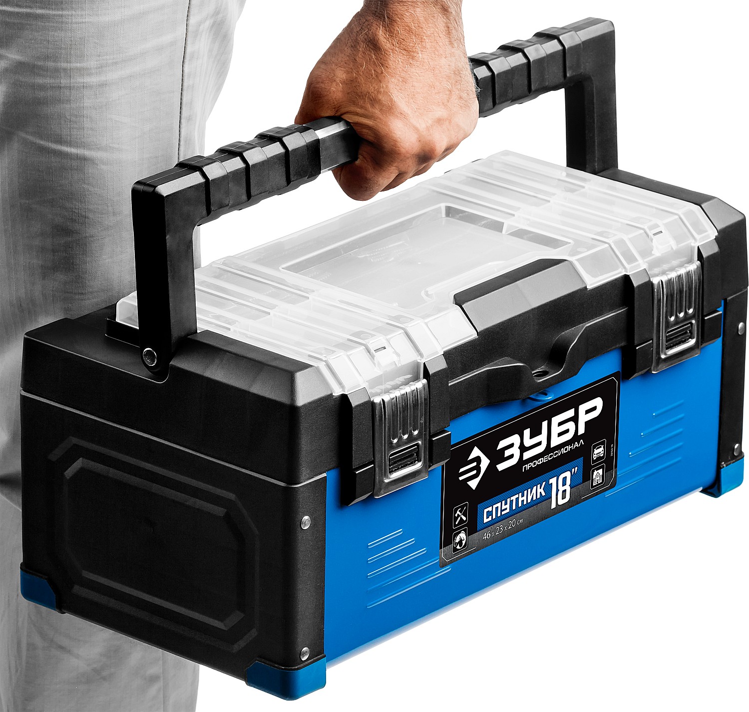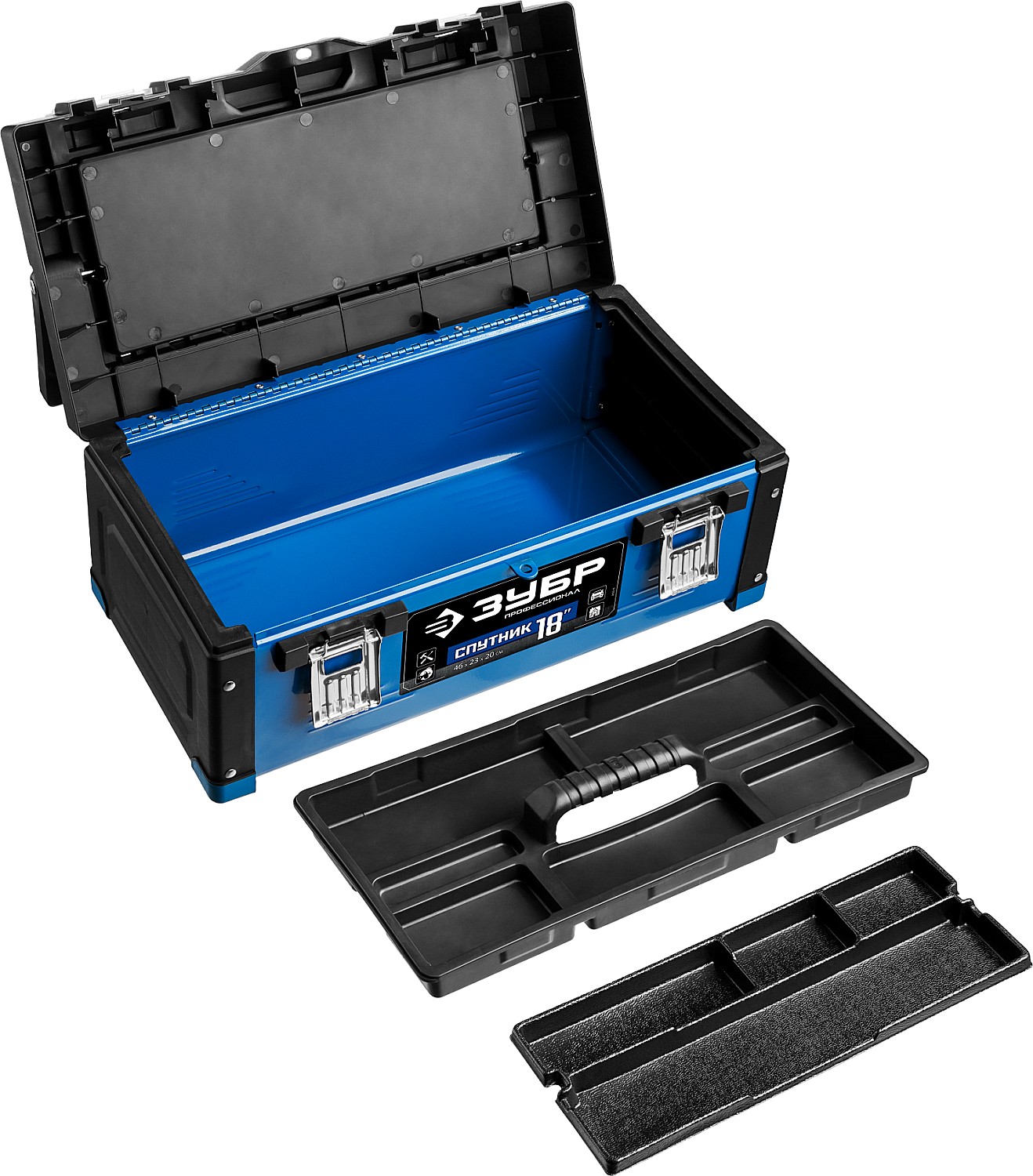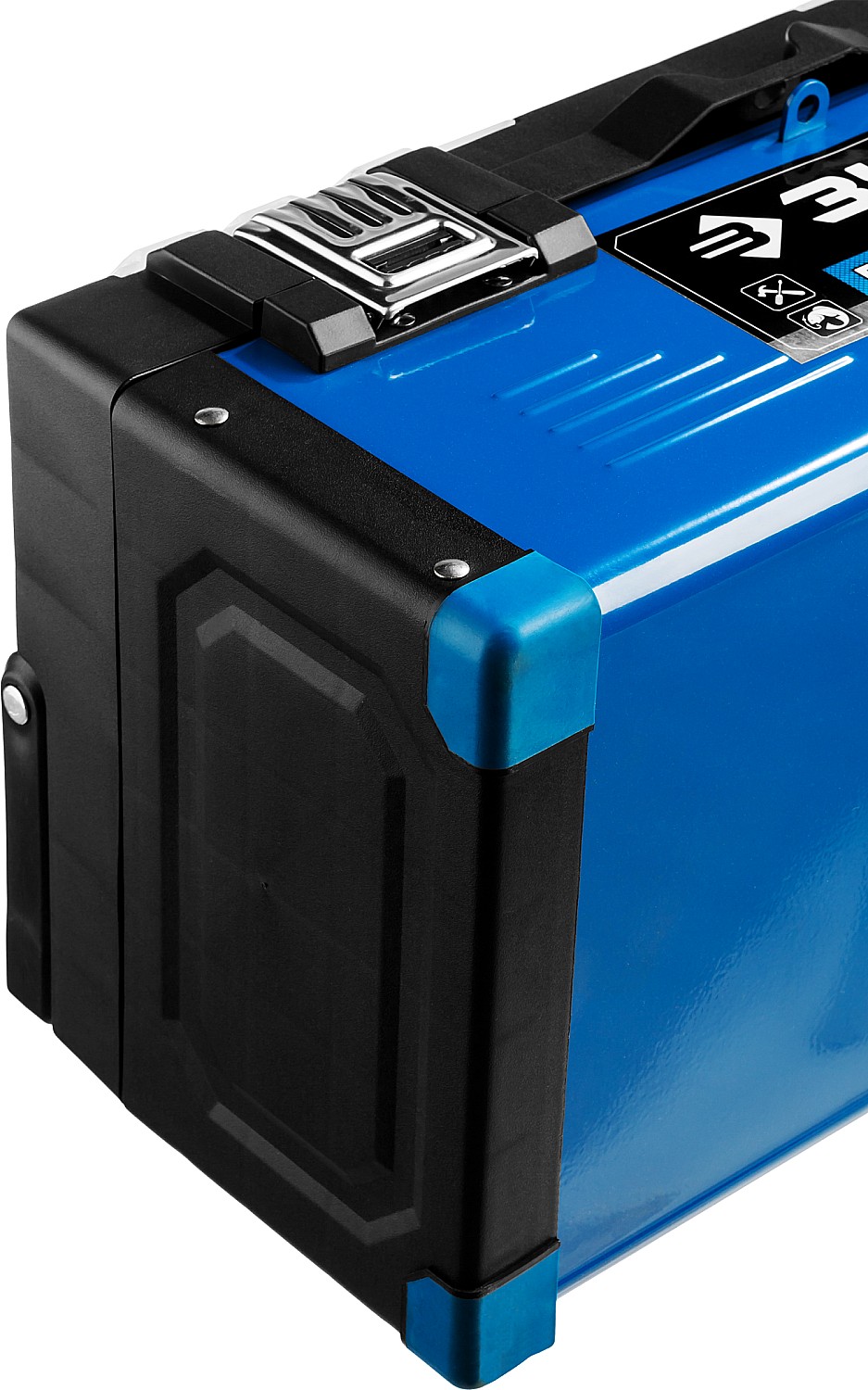 Прочный металлический ящик позволяет организовать удобное и надежное хранение большого количества инструментов. Широкая алюминиевая рукоятка помогает сместить центр тяжести ящика, если это необходимо