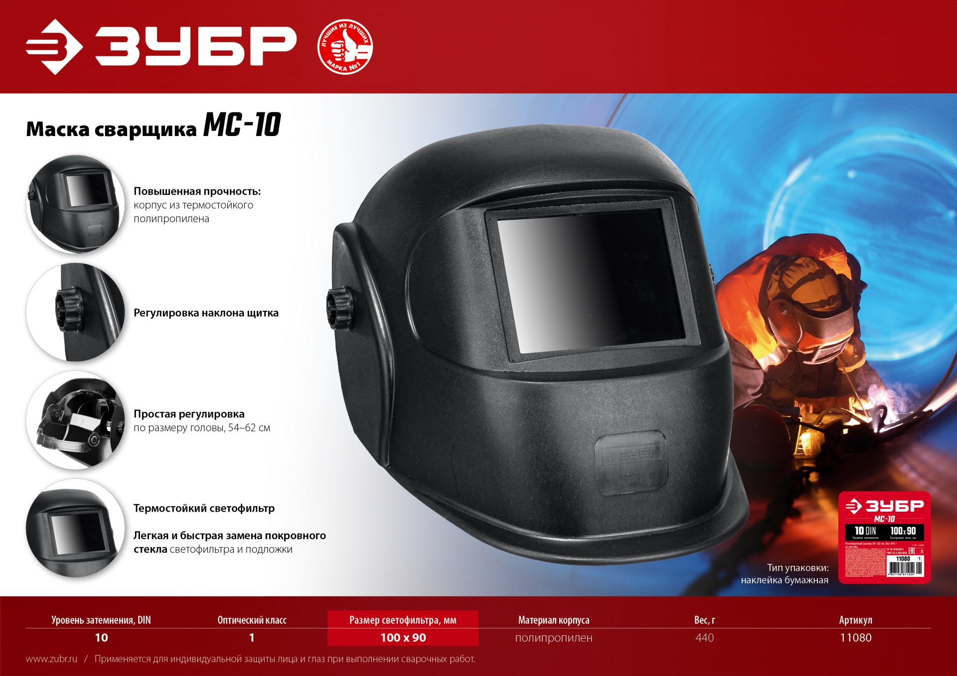 Сварочный щиток ЗУБР предназначен для индивидуальной защиты лица и глаз сварщика от яркого светового, ультрафиолетового и инфракрасного излучения, брызг расплавленного металла и искр при выполнении сварочных работ, резки и пайки металла.
