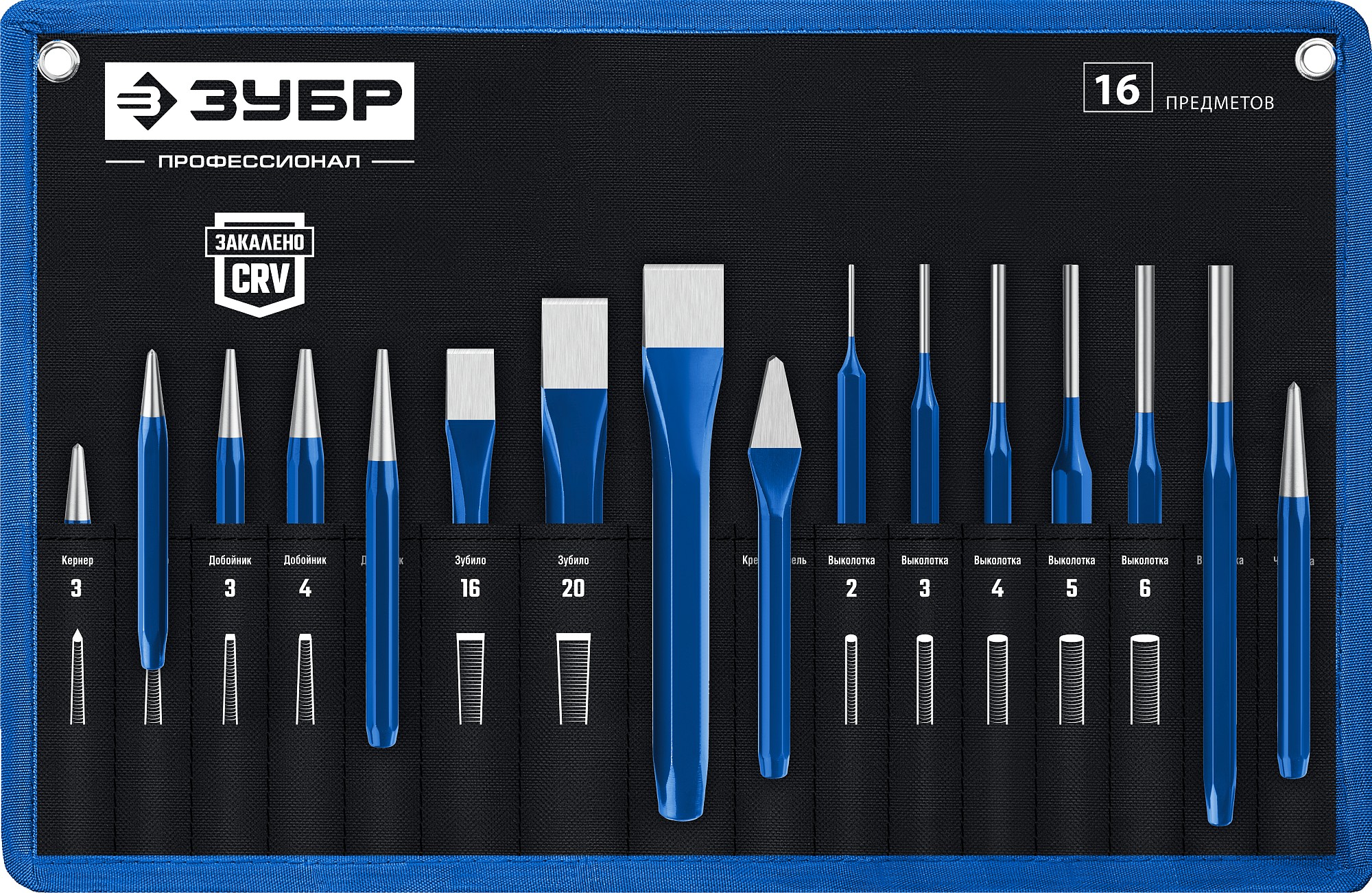 Набор высококачественных зубил и кернеров. Произведены из хромованадиевой стали. Шестигранный профиль для повышенных нагрузков. Закалены