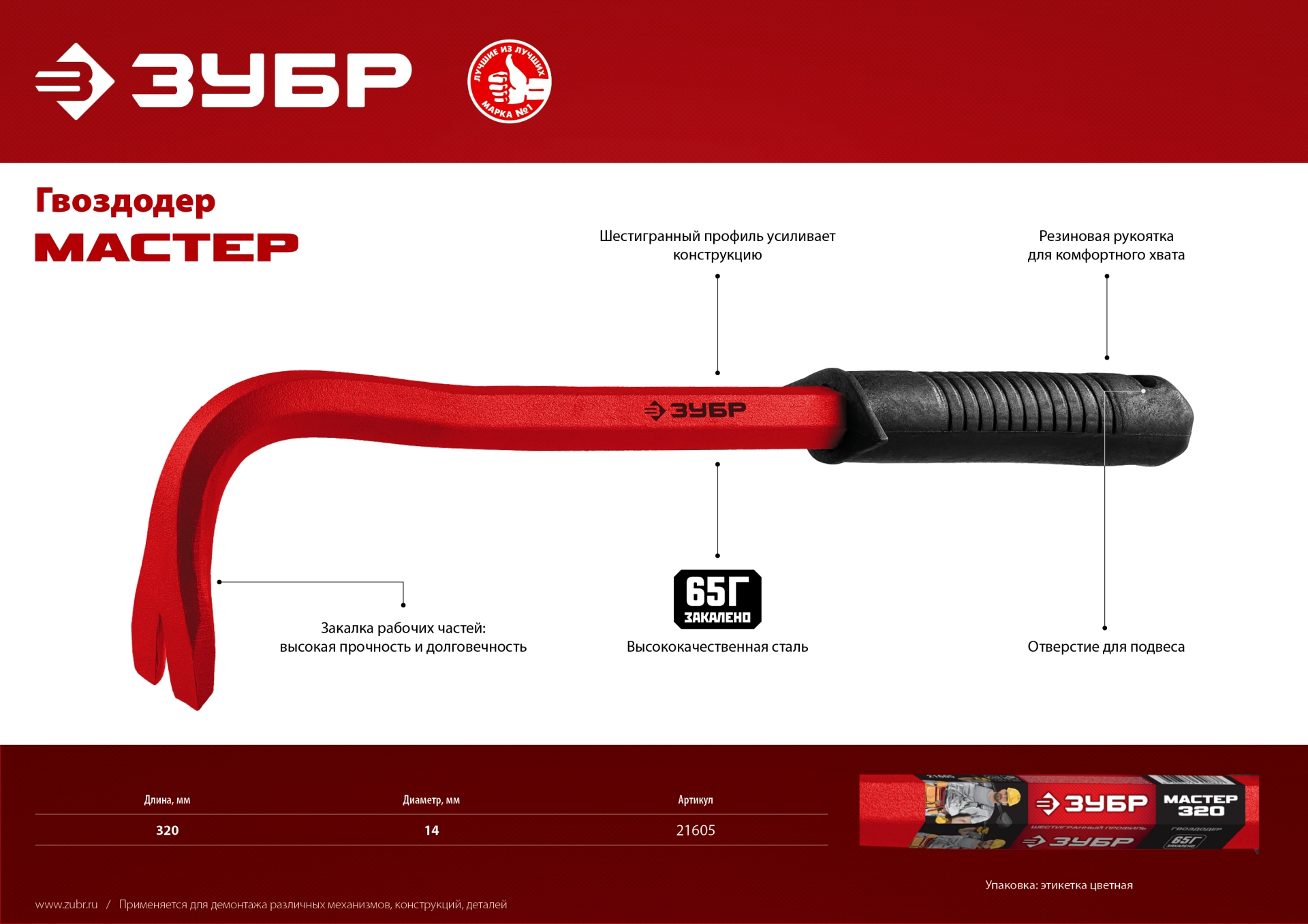 Профессиональный инструмент для демонтажных работ «ЗУБР» выдерживает длительные высокие нагрузки, обладает высоким ресурсом, имеет длительный срок службы и обеспечивает качественную работу.